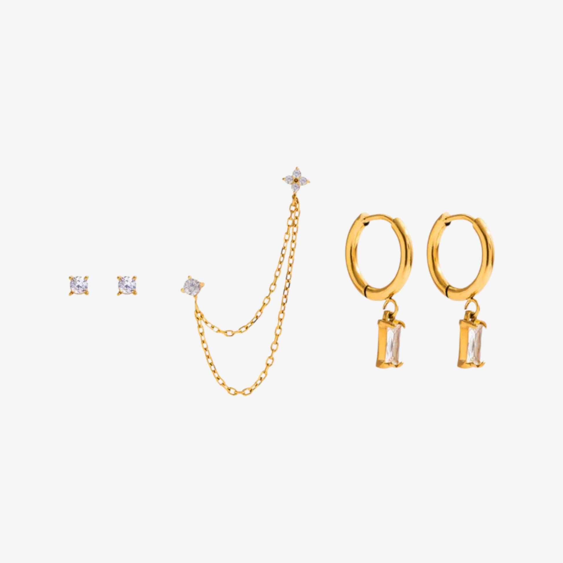 • Design: Multi-piece earring set including studs, chain studs, and drop hoops